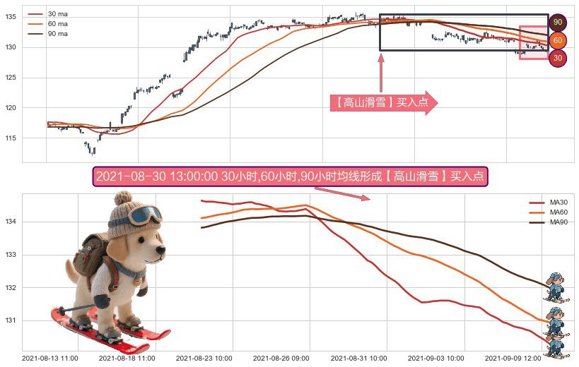 形态多维评估: ⚀ 2021-08-20 09:00:00小时-2021-09-09 14:00:00小时显现 30小时-60小时-90小时均线 【高山滑雪】买入点 看多信号,后市看涨,买入