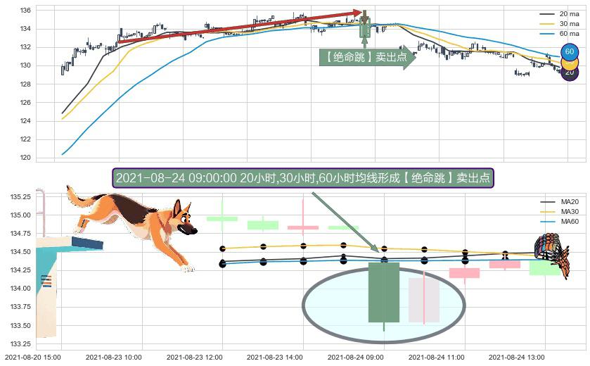 形态多维评估: ⚀ 2021-08-24 09:00:00小时显现 20小时-30小时-60小时均线 【绝命跳】卖出点 看空信号,后市看跌,卖出