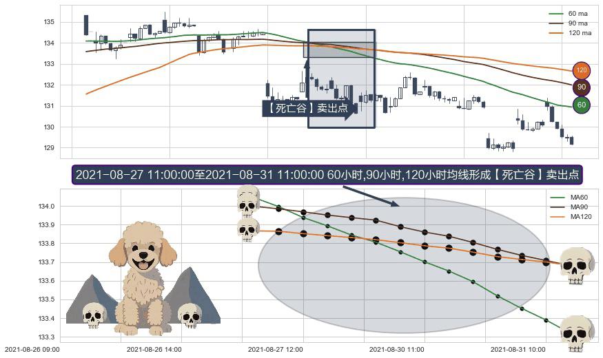 形态多维评估: ⚀ 2021-08-27 12:00:00-小时至2021-08-31 11:00:00-小时显现 60小时-90小时-120小时均线 【死亡谷】卖出点 看空信号,后市看跌,卖出