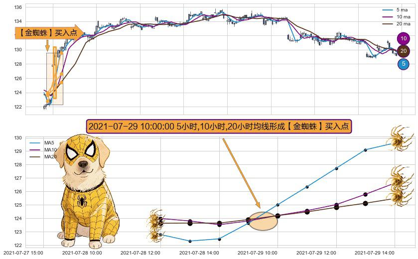 形态多维评估: ⚀ 2021-07-29 10:00:00小时显现 5小时-10小时-20小时均线 【金蜘蛛】买入点 看多信号,后市看涨,买入