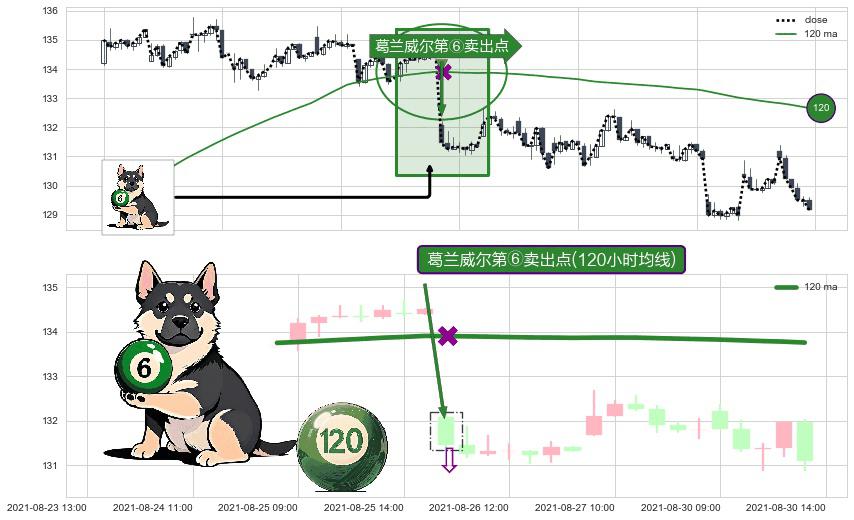 形态多维评估: ⚀ 2021-08-26 09:00:00-小时显现 葛兰威尔均线 120小时均线 第⑥卖出点 走势反转见顶信号,后市看跌,卖出信号
