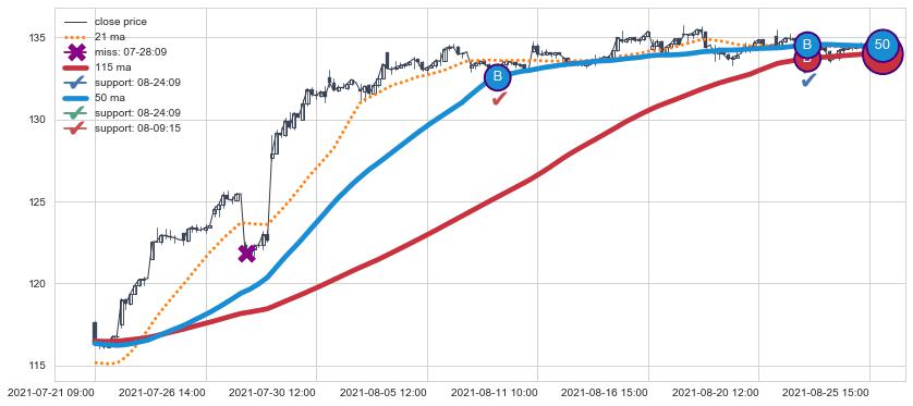 上涨趋势07-21 09:00-08-25 15:00,均线50, 115确认关键支撑2处