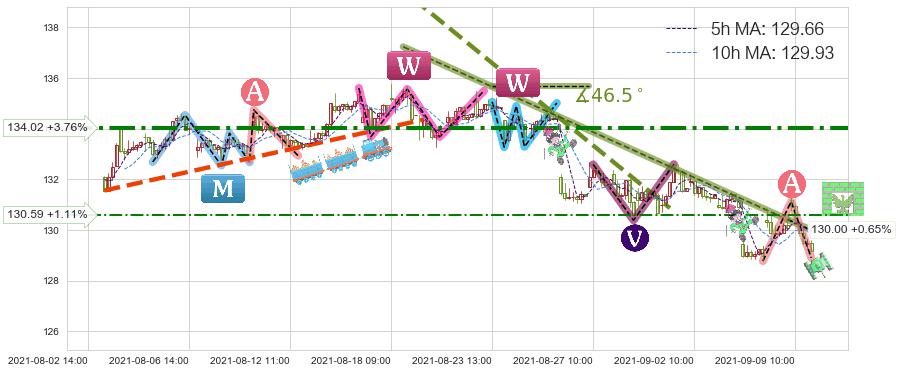♞ 5小时均线:129.66,10小时均线:129.93→ 快线<慢线