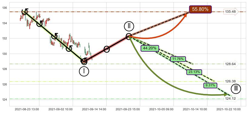 ➢ 循环浪继续向下【最低】位置(10-22:10, 124.12),匹配聚类样本比例21.07%, 可能性概率9.31%