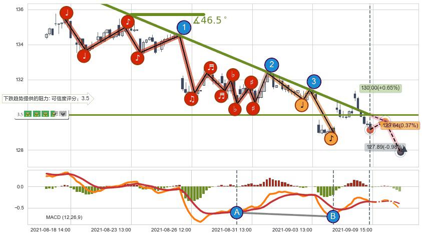 ♘ 在最后的下跌阶段2021-08-18 12:00至2021-09-08 14:00,存在 持续未破位的阻力位 ,阻力价格130.00,可信任强度77.49%,其距离最后价格129.16相差 +0.65%