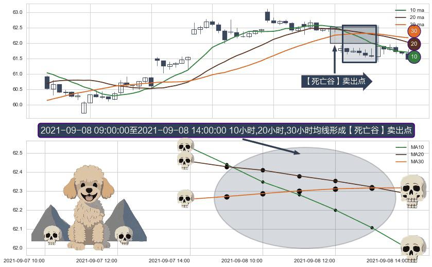 ⚀ 2021-09-08 10:00:00-小时至2021-09-08 14:00:00-小时显现 10小时-20小时-30小时均线 【死亡谷】卖出点 看空信号,后市看跌,卖出