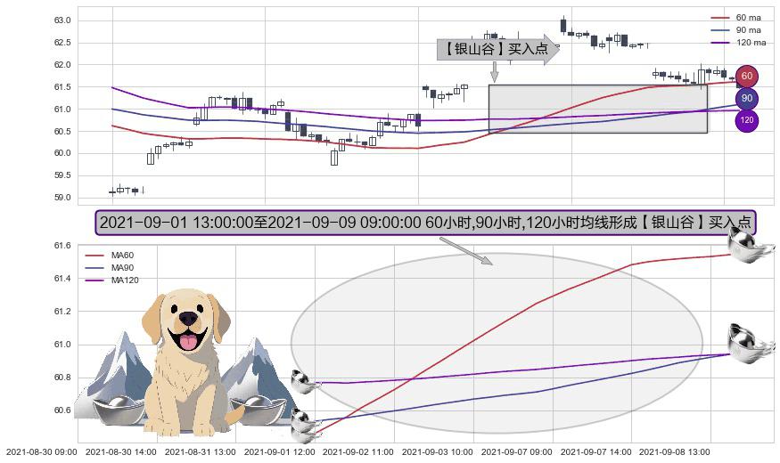 ⚀ 2021-09-01 14:00:00-小时至2021-09-09 09:00:00-小时显现 60小时-90小时-120小时均线 【银山谷】买入点 看多信号,后市看涨,买入