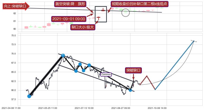 从2021-06-24 09:00至2021-08-30 14:00,共包含287个小时,阶段股价下跌-9.85%,阶段股价变动位移路程比: 1 : 8,下跌趋势角度: 61.4,2021-07-27 09:00向↘︎形成缺口,跳空下跌-6.14%˚