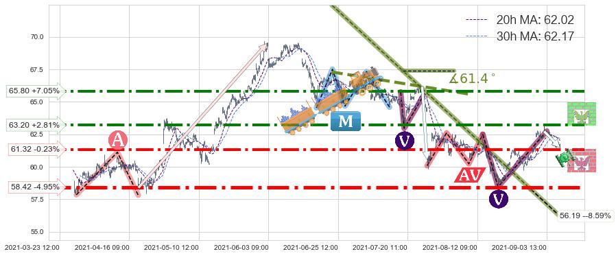 ♘ 阻力价格位65.80,可信任强度84.85%,距离最后交易2021-09-09 14:00形成的收盘价格61.47相差 +7.05%