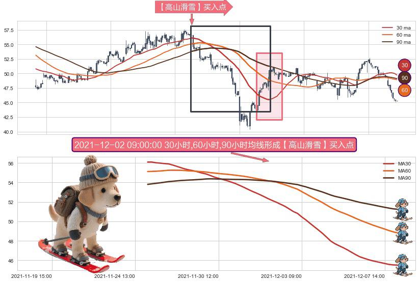 形态多维评估: ⚀ 2021-11-24 16:00:00小时-2021-12-08 10:00:00小时显现 30小时-60小时-90小时均线 【高山滑雪】买入点 看多信号,后市看涨,买入
