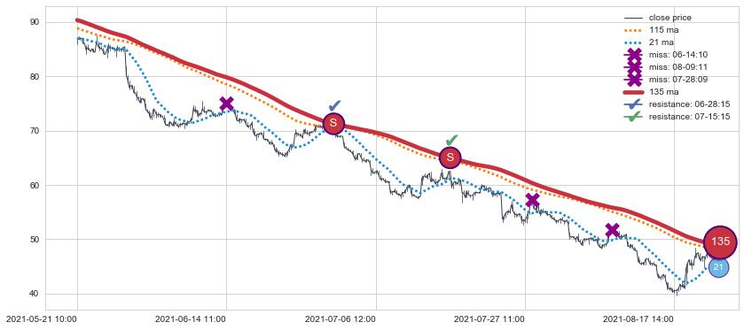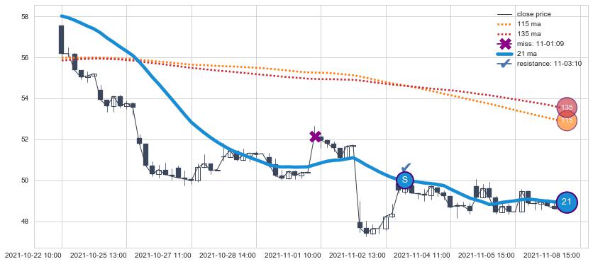 下跌趋势05-21 10:00-08-23 11:00,均线135确认关键阻力2处