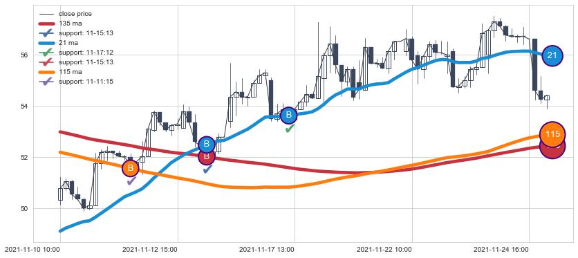 上涨趋势11-10 10:00-11-26 11:00,均线115, 21, 135确认关键支撑3处