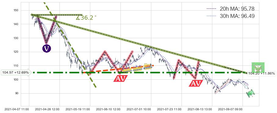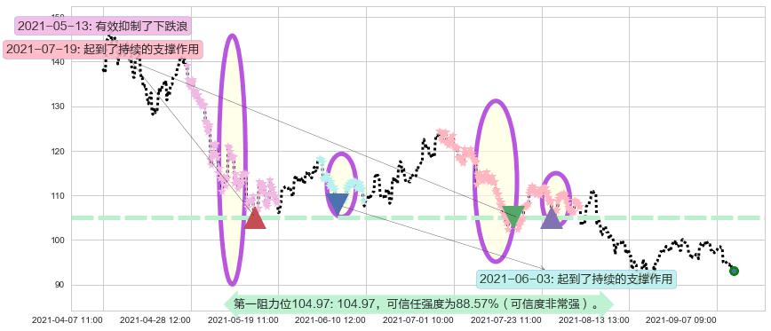 ♘ 阻力价格位104.97,可信任强度88.57%,距离最后交易2021-09-09 14:00形成的收盘价格93.15相差 +12.69%