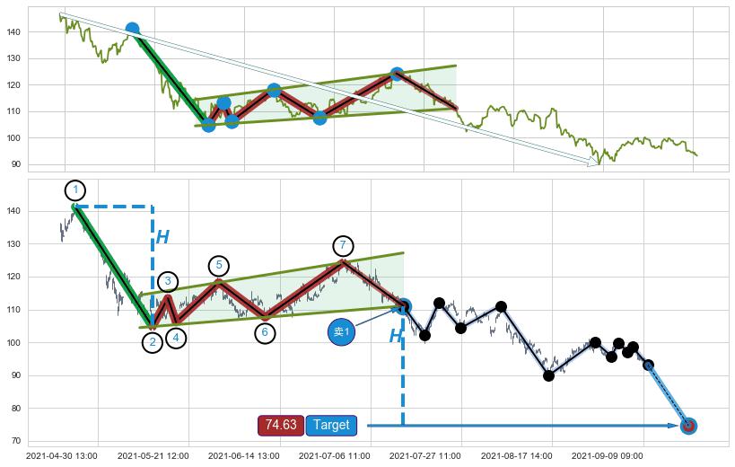 从2021-04-08 14:00至2021-05-24 11:00,共包含212个小时,阶段股价下跌-23.55%,阶段股价变动位移路程比: 1 : 8,下跌趋势角度: 77.2