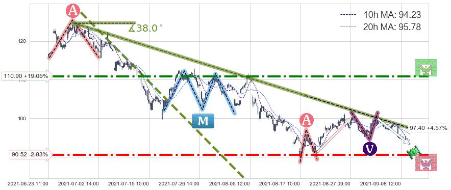 ♘ 在最后的下跌阶段2021-06-28 14:00至2021-08-18 09:00,存在 持续未破位的阻力位 ,阻力价格97.40,可信任强度76.46%,其距离最后价格93.15相差 +4.57%