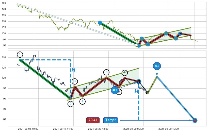➣ 最小中继整理跌幅→𝐇: 9.86 (上平行阻力线与下平行支撑线的垂直距离)