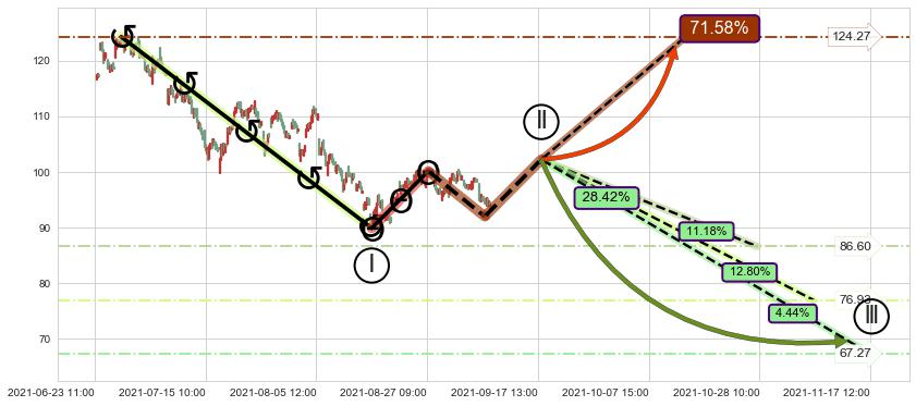 ➢ 循环浪继续向下【最低】位置(11-17:12, 67.27),匹配聚类样本比例15.61%, 可能性概率4.44%