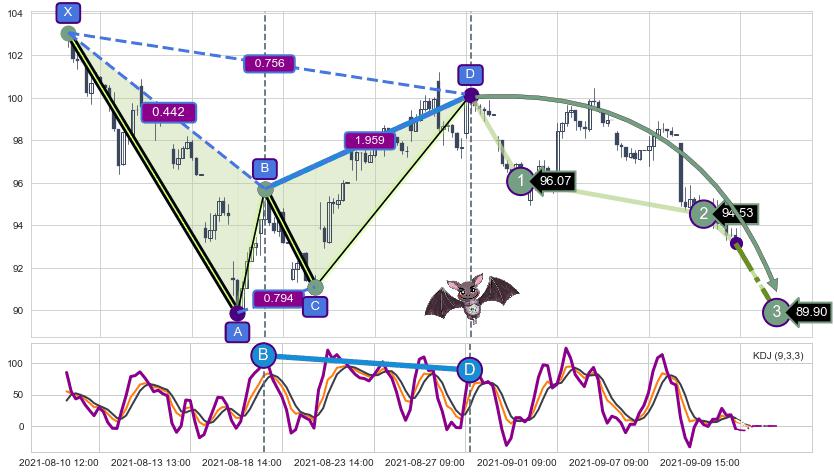 ➣ 已完成【蝙蝠】形态起点X: 08-09:12, 终点D: 08-27:10, 共89交易小时