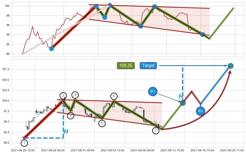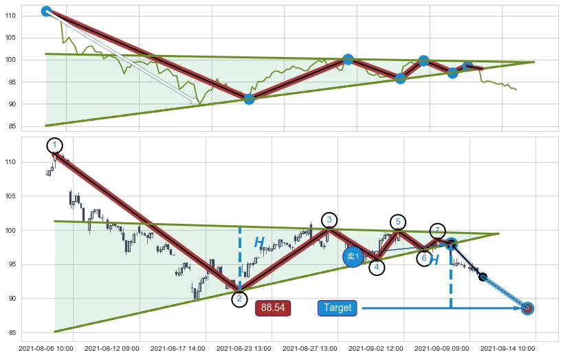 ➢ 最小中继整理跌幅→𝐇: 9.42 (低点逐步抬高斜边第一支撑点②与阻力边垂直距离)