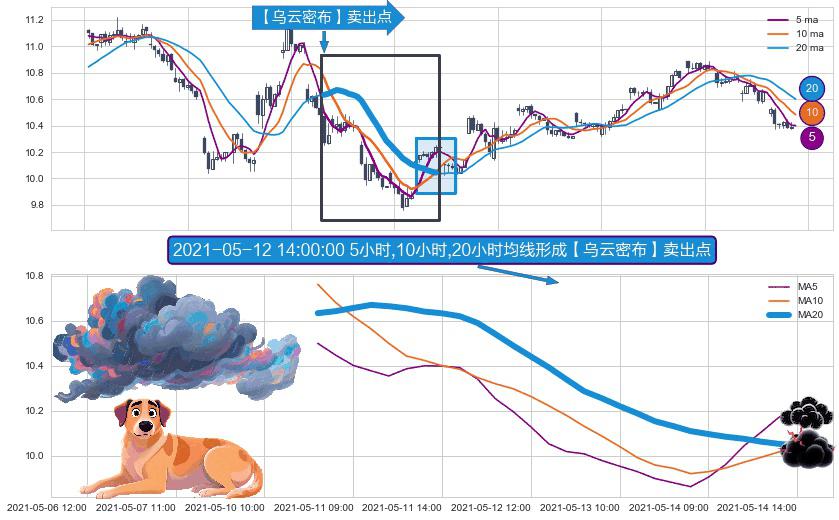 形态多维评估: ⚀ 2021-05-10 13:00:00小时-2021-05-14 14:00:00小时显现 5小时-10小时-20小时均线 【乌云密布】卖出点 看空信号,后市看跌,卖出