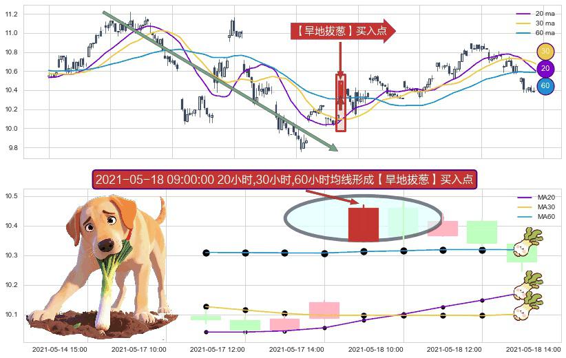 形态多维评估: ⚀ 2021-05-18 09:00:00小时显现 20小时-30小时-60小时均线 【旱地拔葱】买入点 看多信号,后市看涨,买入