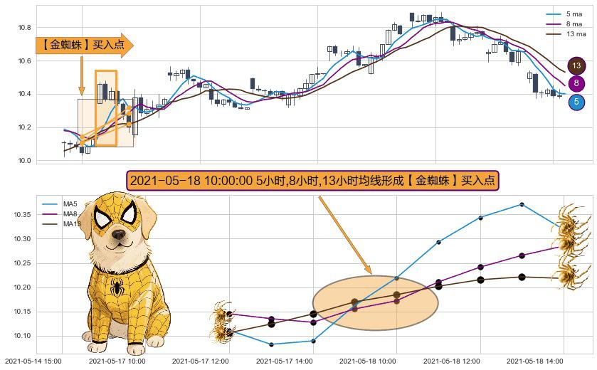形态多维评估: ⚀ 2021-05-18 10:00:00小时显现 5小时-8小时-13小时均线 【金蜘蛛】买入点 看多信号,后市看涨,买入