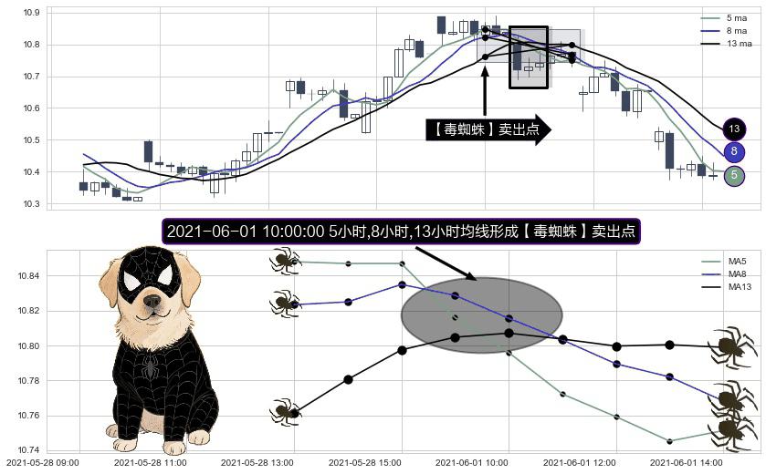 形态多维评估: ⚀ 2021-06-01 10:00:00小时显现 5小时-8小时-13小时均线 【毒蜘蛛】卖出点 看空信号,后市看跌,卖出