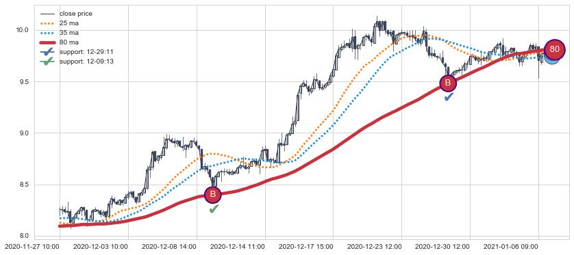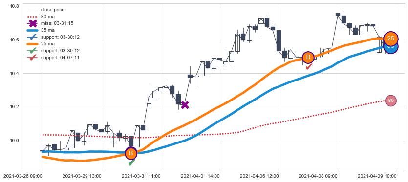 上涨趋势03-26 09:00-04-09 10:00,均线25, 35确认关键支撑2处