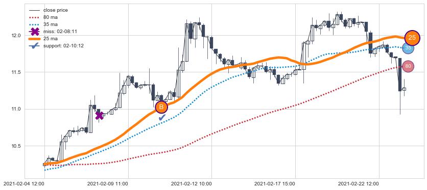 上涨趋势02-04 12:00-02-23 10:00,均线25确认关键支撑1处