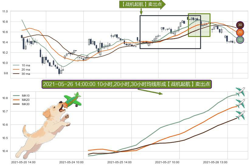 形态多维评估: ⚀ 2021-05-24 11:00:00小时-2021-05-28 15:00:00小时显现 10小时-20小时-30小时均线 【战机起航】卖出点 看空信号,后市看跌,卖出