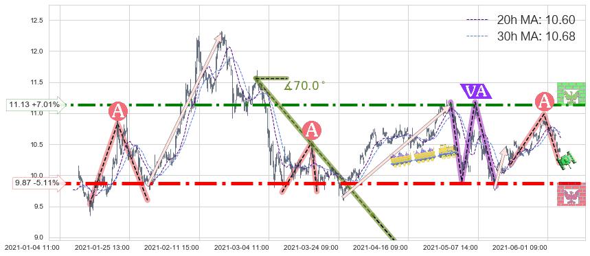 ➢ 【仅预测突破】最后价格:10.40与预测突破价格:9.96→【空间临近】后续最小【整理】第一目标价格→(06-16:11: 8.80 )