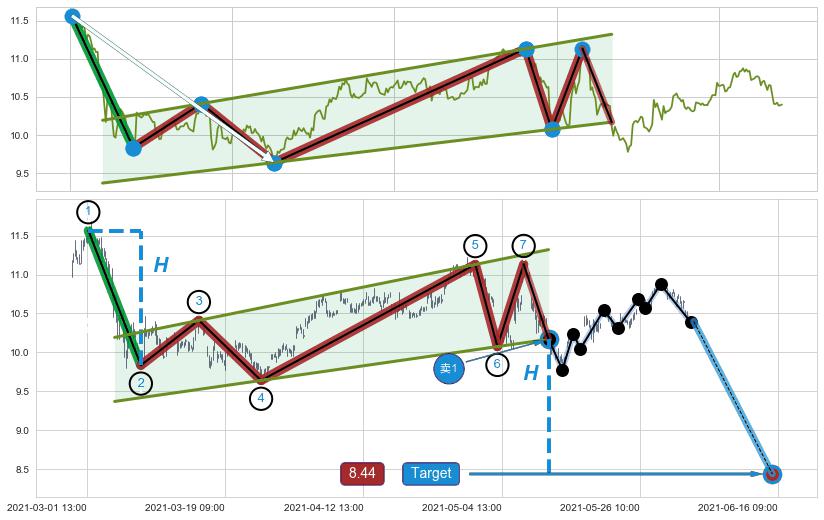 ➢ 【仅预测突破】最后价格:10.40与预测突破价格:9.96→【空间临近】后续最小【整理】第一目标价格→(06-21:10: 8.36 )