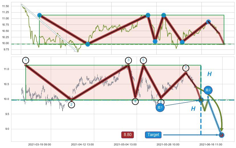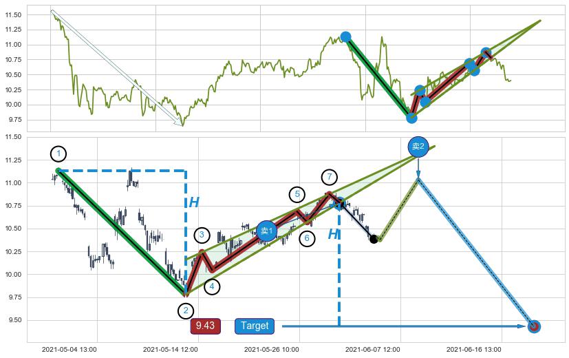 ➣ 【阻力】连续作用在→【③⑤⑦】形成上阻力震荡平行线
