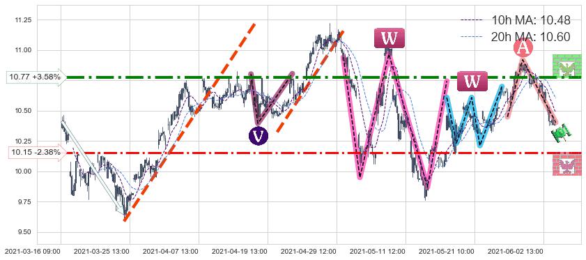 ♞ 10小时均线:10.48,20小时均线:10.60→ 快线<慢线