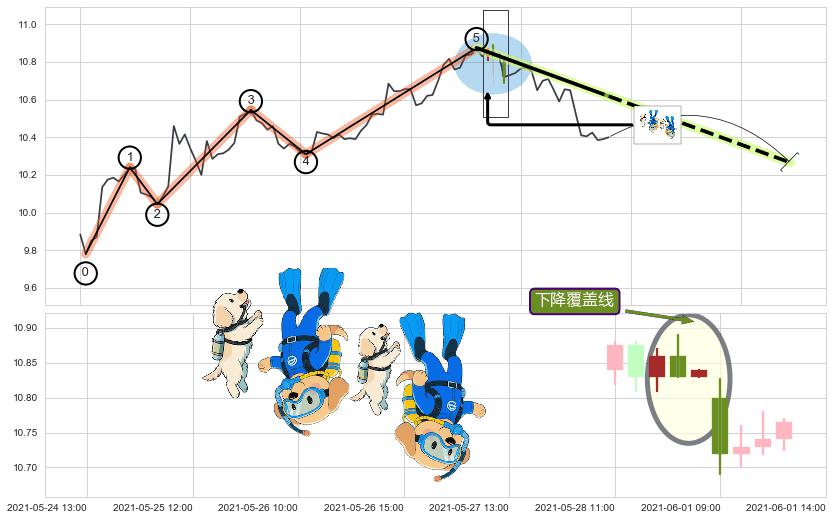 从2021-04-26 11:00至2021-05-13 12:00,共包含85个小时,阶段股价下跌-10.40%,阶段股价变动位移路程比: 1 : 5