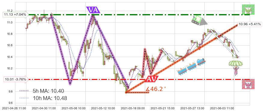 ✂️ 2021-05-13 12:00-2021-05-28 15:00上升趋势存在反转[风险],其原上升趋势的支撑位(10.96)已破位[强阻力信号],原上升趋势角度: 46.2˚