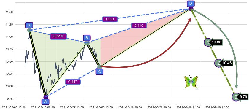 ➣ 未完成【蝴蝶】形态起点X: 05-07:10, 已到达C点: 06-03:13, 预测最终D点: 07-06:09, 共279交易小时