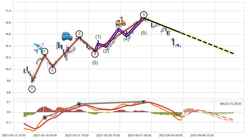 ➢ 最后的上涨趋势2021-05-13 12:00至2021-05-28 15:00:存在破位迹象,后续小调整或者反转下跌