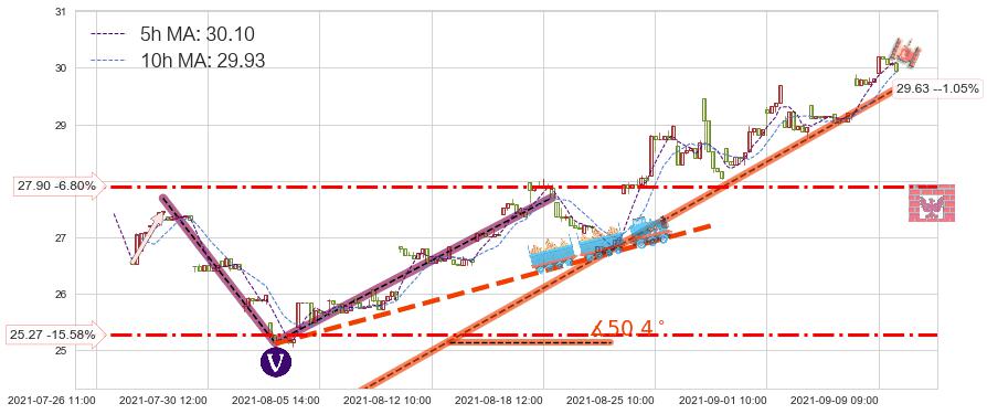 ♘ 在最后的上升阶段2021-08-04 10:00至2021-09-09 14:00存在 持续未破位的支撑位 ,支撑价格29.63,支撑可信任强度83.29%,其距离最后价格29.94相差 -1.05%