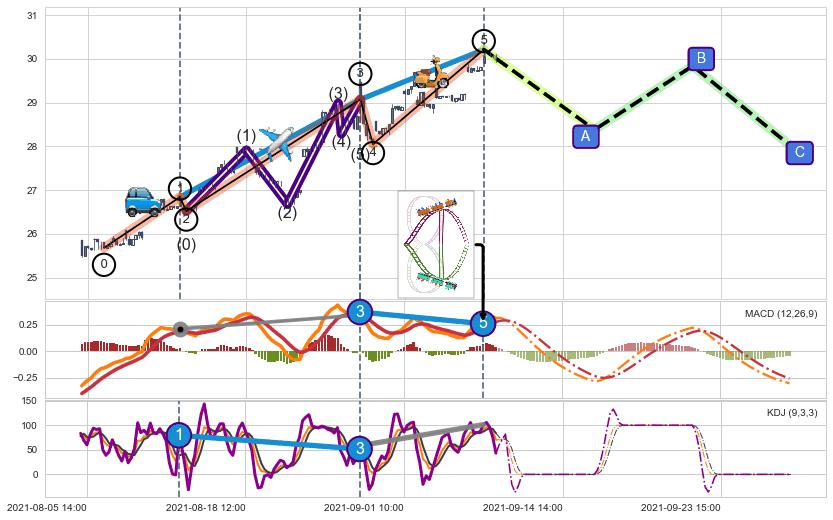 ➣ 第一, 三驱动浪端点:【KDJ】走势出现【常规背离 & 反转信号】背离程度34.35%,背离夹角角度61.8˚,背离程度较小
