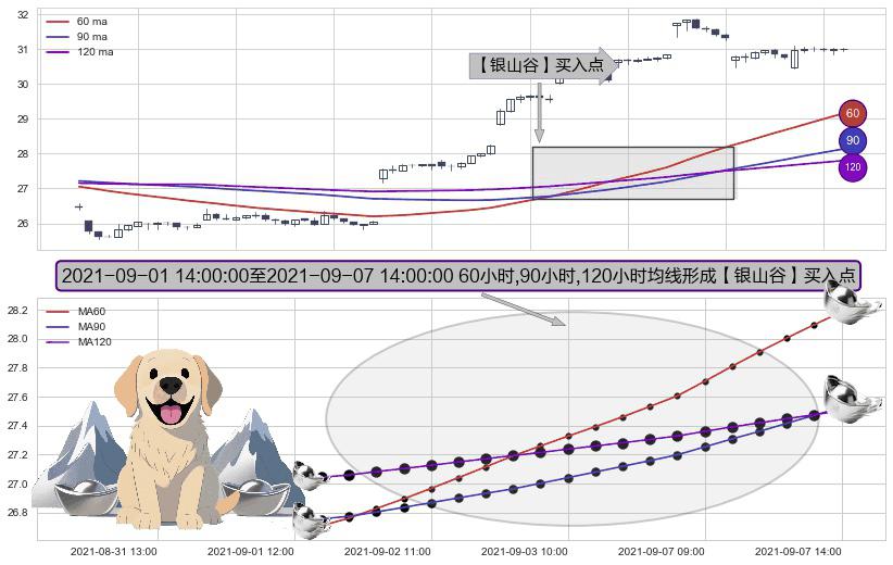 形态多维评估: ⚀ 2021-09-02 09:00:00-小时至2021-09-07 14:00:00-小时显现 60小时-90小时-120小时均线 【银山谷】买入点 看多信号,后市看涨,买入