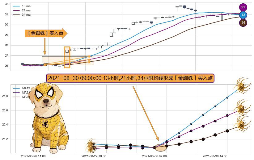 形态多维评估: ⚀ 2021-08-30 09:00:00小时显现 13小时-21小时-34小时均线 【金蜘蛛】买入点 看多信号,后市看涨,买入