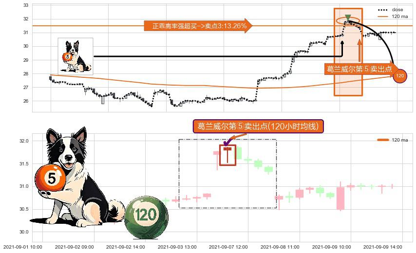 形态多维评估: ⚀ 2021-09-07 10:00:00-小时显现 葛兰威尔均线 120小时均线 第⑤卖出点 上升趋势均值回复的短线回落信号,后市看跌,卖出信号
