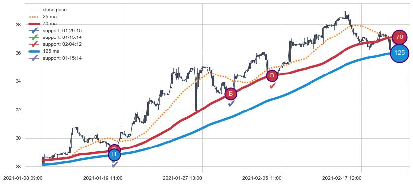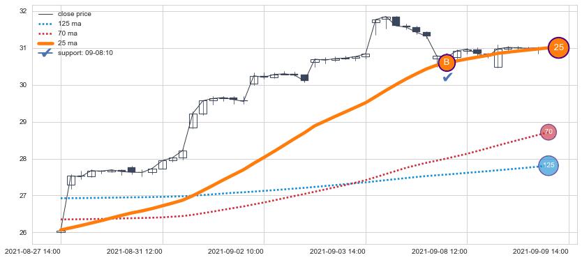 上涨趋势01-08 09:00-02-22 10:00,均线125, 70确认关键支撑3处