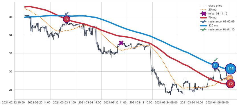 下跌趋势02-22 10:00-04-06 09:00,均线125, 70确认关键阻力2处