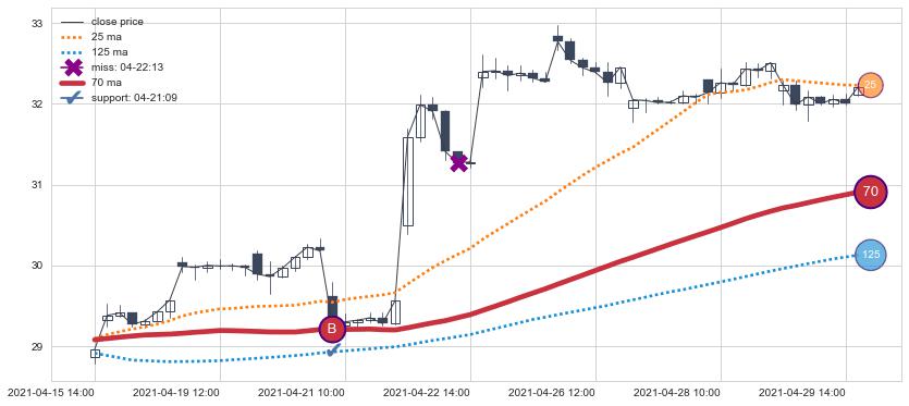 上涨趋势04-15 14:00-04-30 09:00,均线70确认关键支撑1处