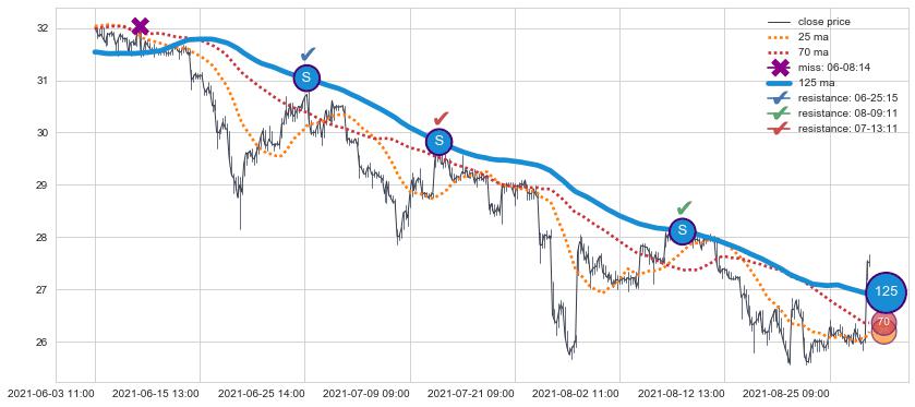 下跌趋势06-03 11:00-08-30 10:00,均线125确认关键阻力3处