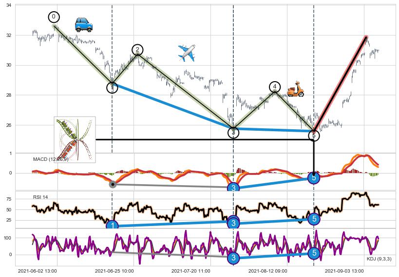 ➣ 1,3,5驱动浪MACD, RSI, KDJ走势都出现【常规背离】反转信号增强