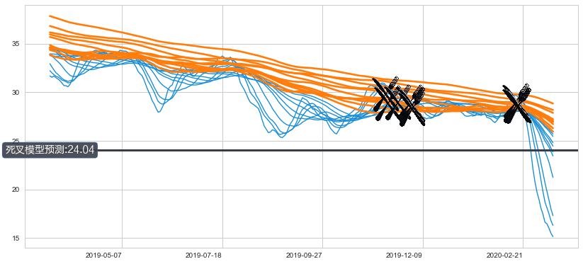➣ 90小时均线于(2020-02-18: 28.52)形成【死叉】基于【死叉历史模型】预测死叉后最低波谷价格: 23.12, 死叉后最低价格13.45,已经下跌超出预测最低波谷价格, 预期反弹