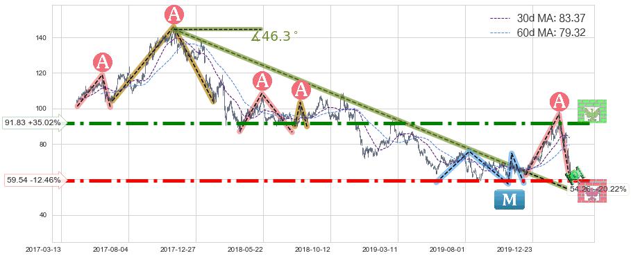♘ 阻力价格位91.83,可信任强度94.28%,距离最后交易2020-03-13形成的收盘价格68.01相差 +35.02%